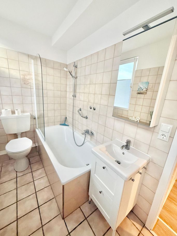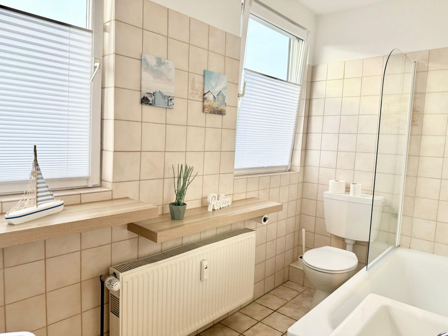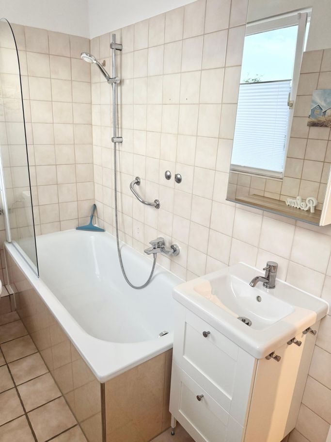 Im Bad gibt es ein WC mit Badewanne und Waschbecken. Nutzen Sie bei schlechtem Wetter gerne das kostenlose WLAN oder den Fernseher mit Amazon Fire TV Stick (persönliche Login Daten erforderlich).