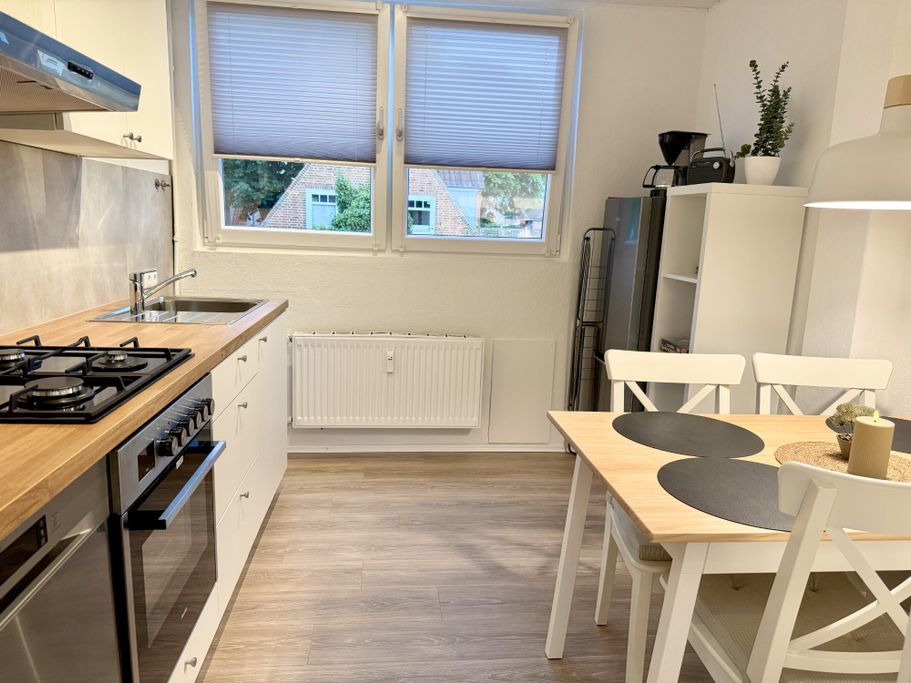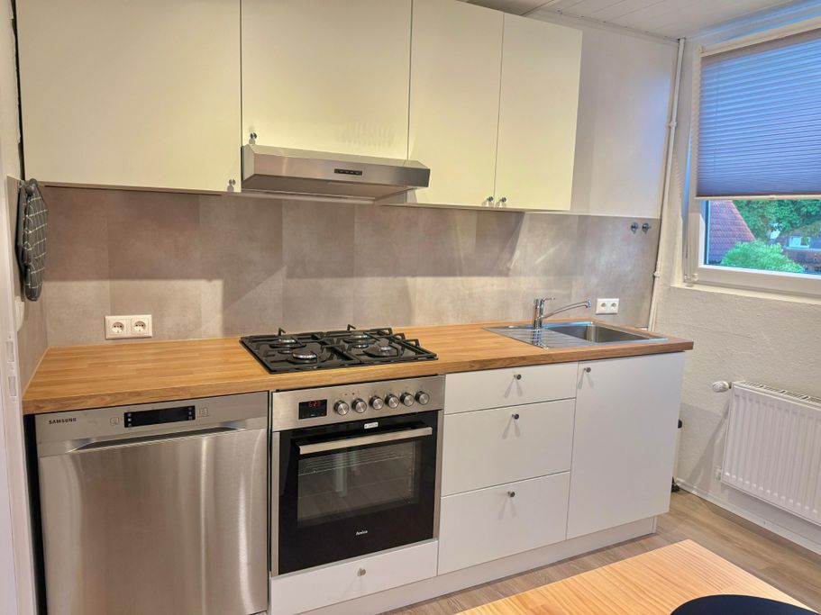 - Küche mit Esstisch, Kühl-Gefrierkombination, Gasherd, Backofen und Spülmaschine