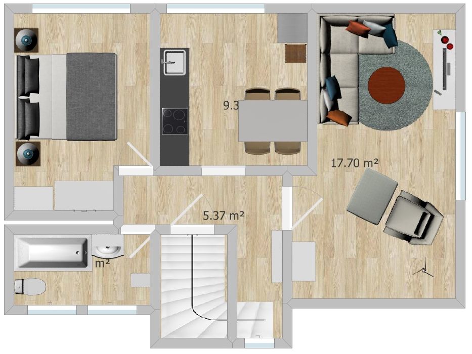 Die Wohnung befindet sich im ersten Obergeschoss des Vorderhauses. Über eine Treppe gelangen Sie direkt in die lichtdurchflutete, geräumige Wohnung.