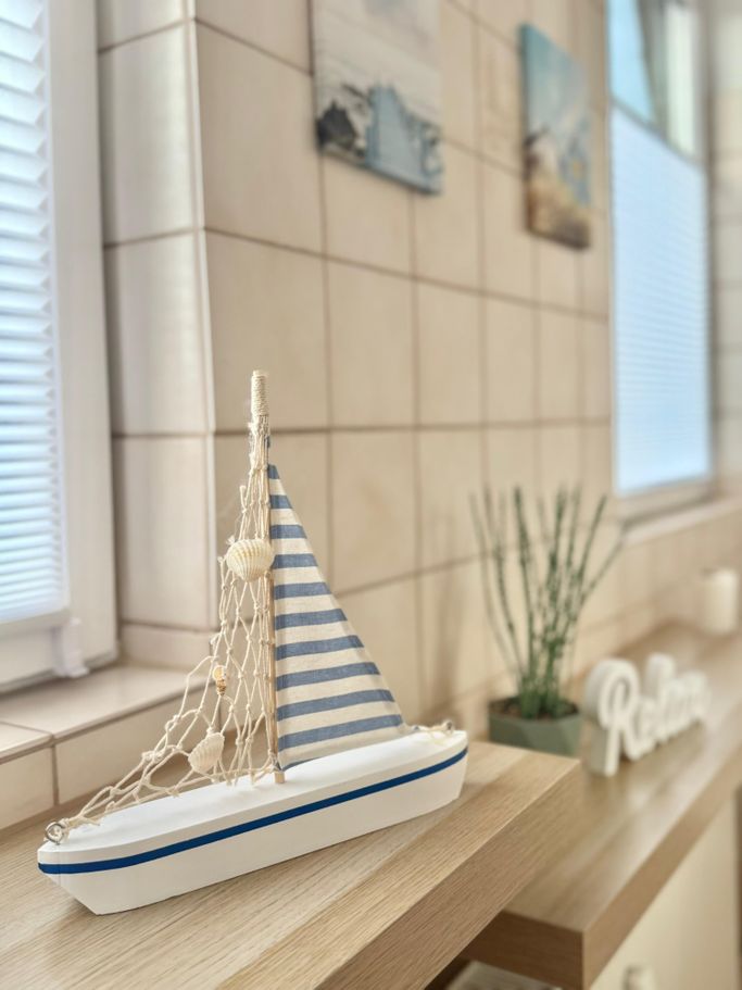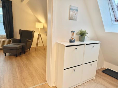 Die Seebude befindet sich im 1. OG des Vorderhauses und befindet sich direkt über der Strandbude. Sie bietet ein geräumiges Schlafzimmer mit Doppelbett (180x200cm), ein Wohnzimmer mit Schlafcouch (140x200cm) sowie eine Küche mit Esstisch. Das großzügig geschnittene Bad bietet Waschbecken, WC und Dusche/Badewanne.